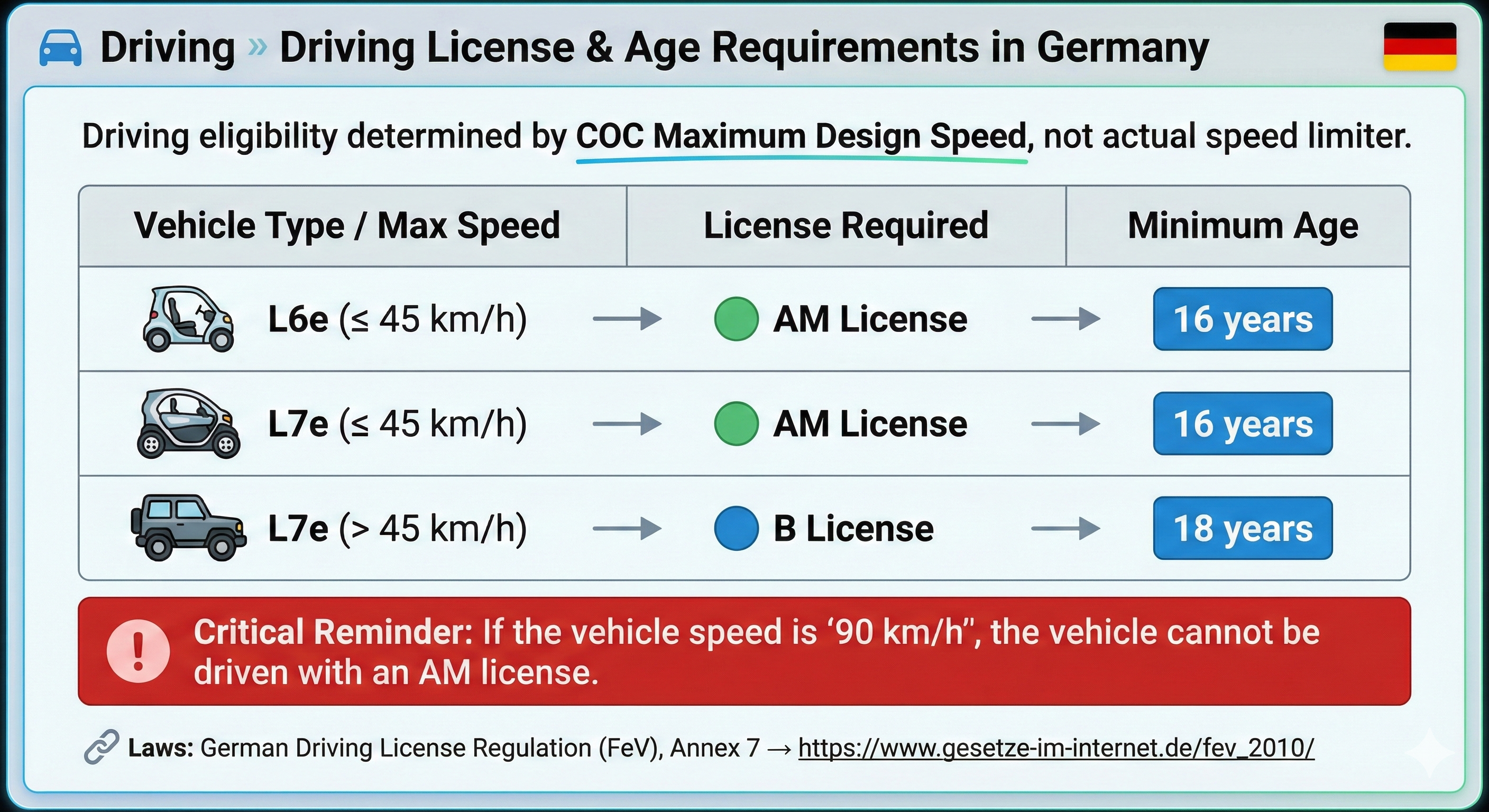Driving eligibility in Germany is determined by the maximum design speed stated in the COC, not the actual speed limiter: